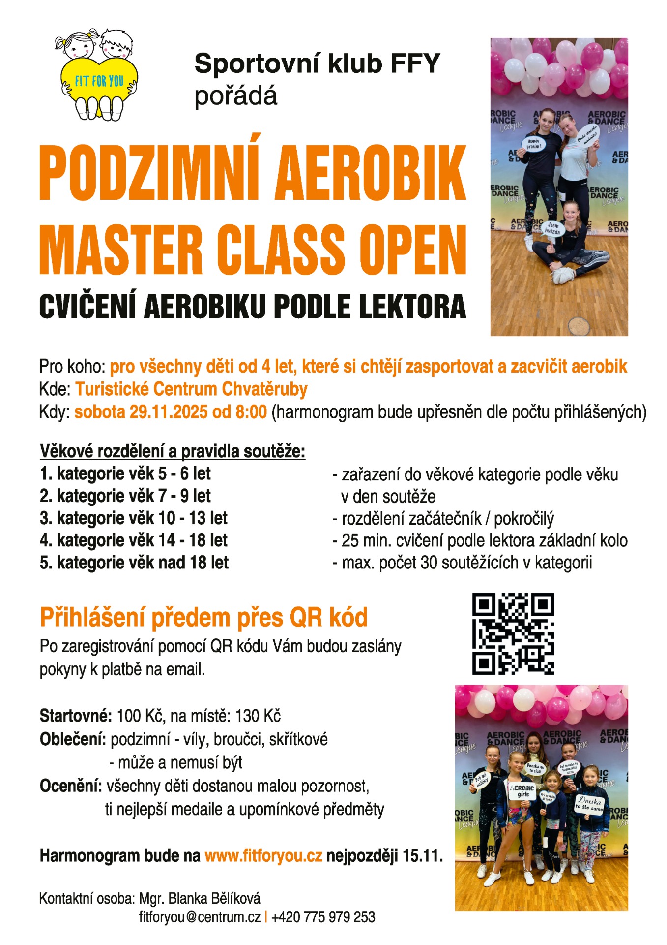 Dodatečný zápis na školní rok 2025/2026 je ve čtvrtek 28.8.2025 od 16:30 do 18:00 a ve čtvrtek 4.9.2025 od 16:00 do 17:30 v Aerobic centru FFY v areálu zimního stadionu v Kralupech nad Vltavou. Také jsou možné konzultace k zařazení do tréninkových skupin.